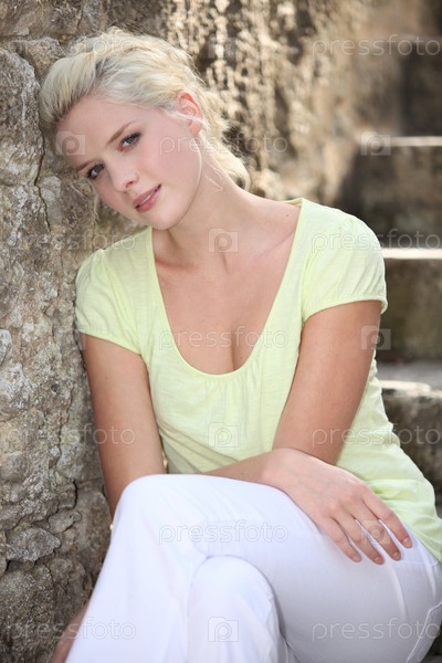 Молодая женщина, сидящая на каменной лестнице