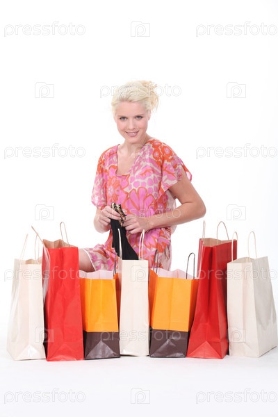 Взволнованная блондинка рассматривает свои покупки