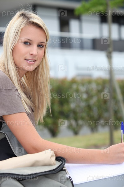 Студентка сидит на улице