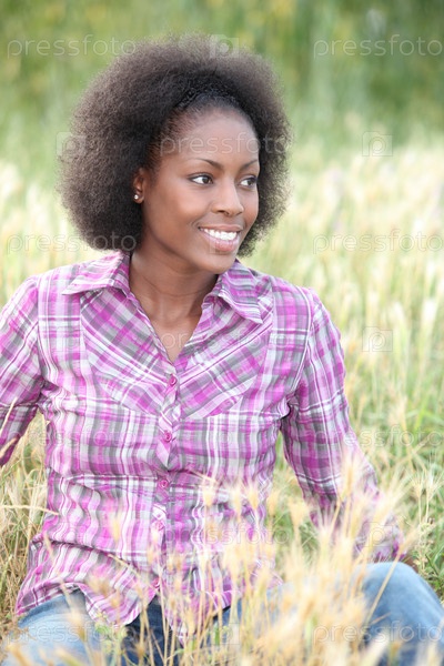 Темнокожая женщина отдыхет, сидя на поле