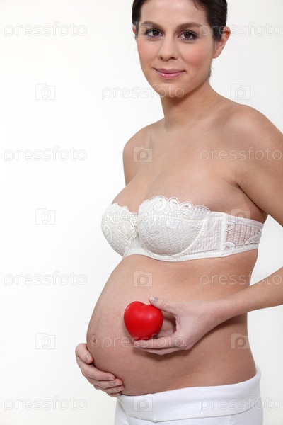 Беременная женщина в белье держит коробку в форме сердца