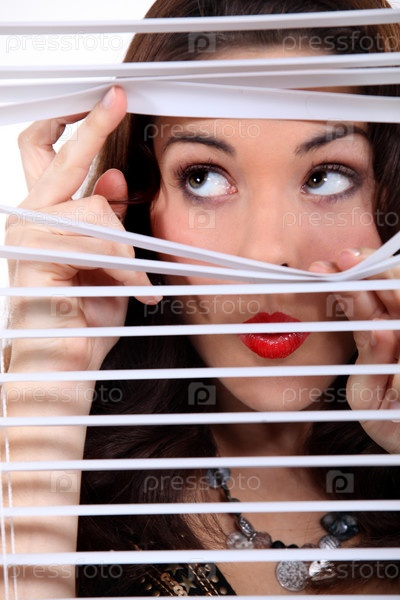 Симпатичная брюнетка шпионит через жалюзи