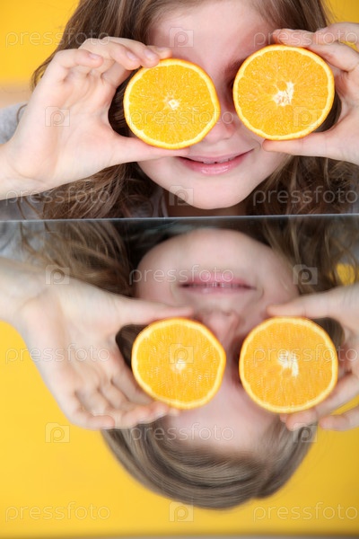 Маленькая девочка играет с апельсином