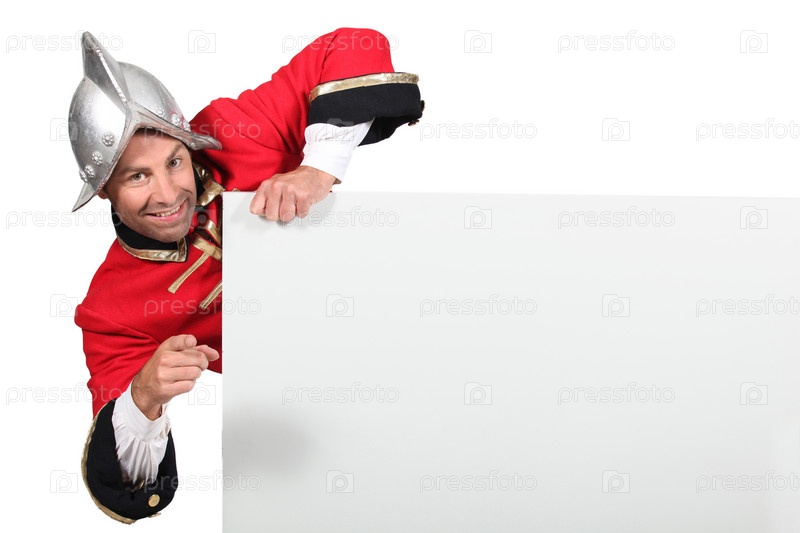 Мужчина в костюме солдата с баннером