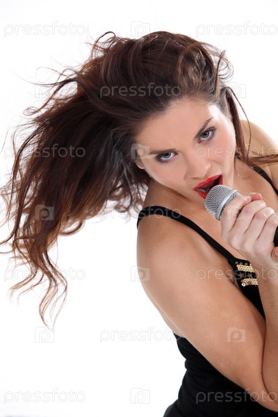 Привлекательная брюнетка поет в микрофон