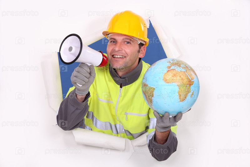 Строитель с громкоговорителем и глобусом