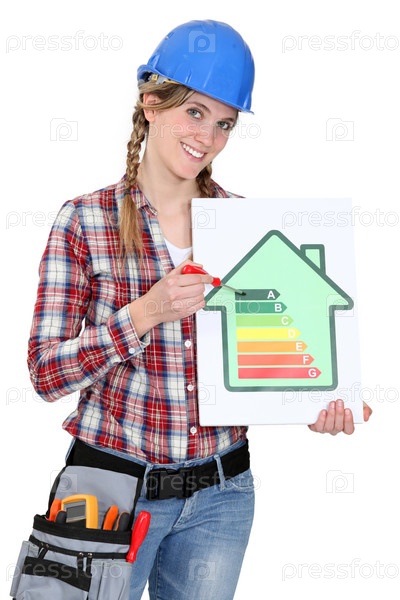 Женщина держит знак экономии энергопотребления