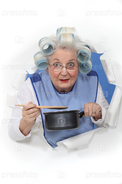 Пожилая женщина перемешивает еду в кастрюле