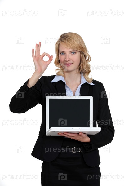 Бизнес-леди с ноутбуком показывает ОК
