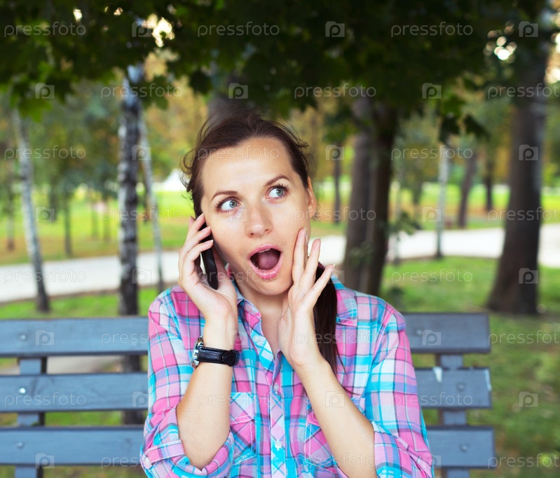 Удивленная женщина разговаривает по телефону в парке на скамейке