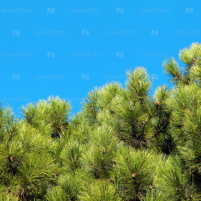 Пышные зеленые сосновые ветви на фоне голубого неба