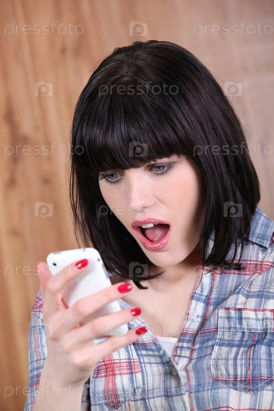 Женщина с недоверием смотрит на мобильный телефон