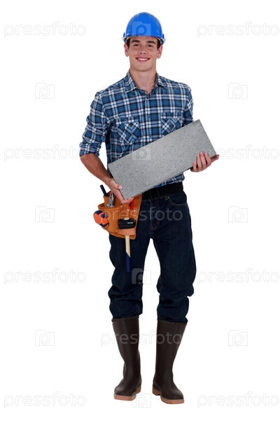 Рабочий с бетонным блоком