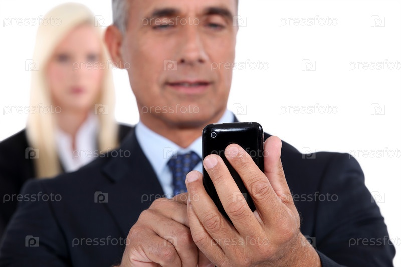 Пожилой бизнесмен пишет текстовое сообщение на сотовом телефоне
