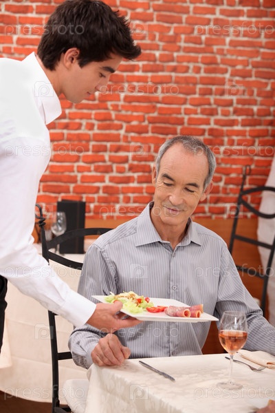 Официант подает блюдо