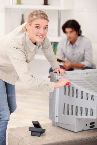 Женщина открывает заднюю панель телевизора