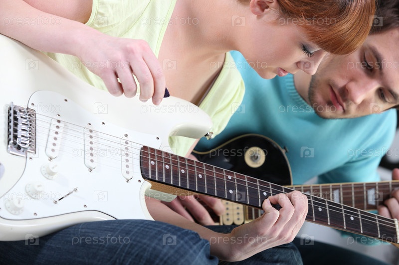 Девушка учится играть на гитаре