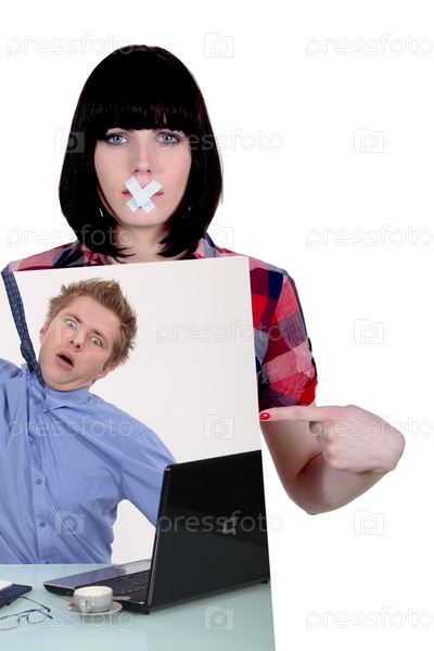 Женщина показывает портрет мужчины, висящего на галстуке