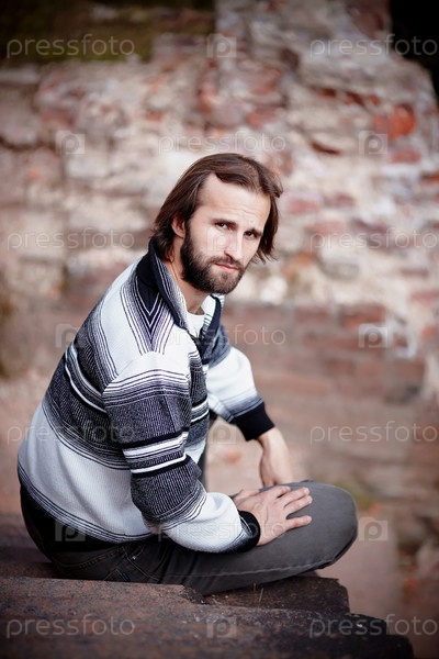 Молодой мужчина сидит на лестнице