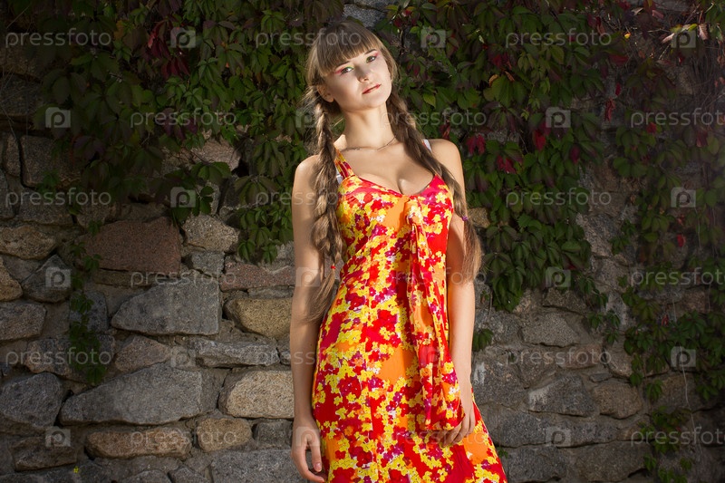 Портрет красивой девушки с длинными русыми косами в ярком платье и с ярким макияжем