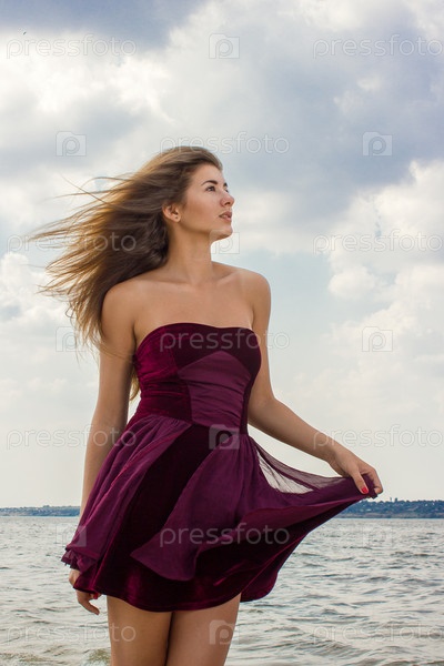 Портрет красивой девушки с длинными каштановыми волосами в коротком платье на природе