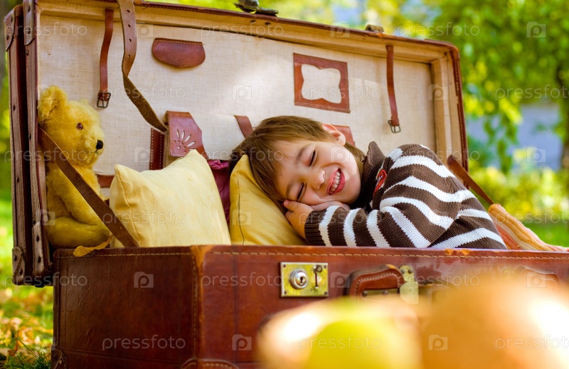 Маленький мальчик спит в большом чемодане в осенннем парке