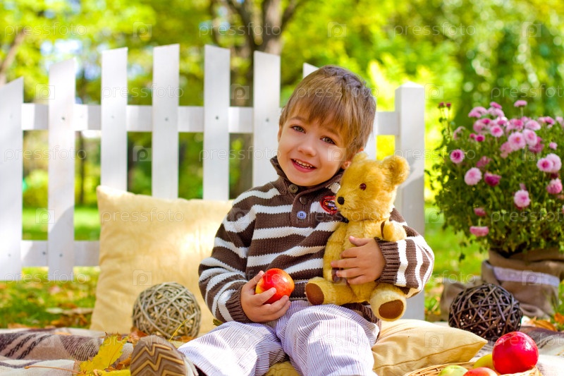 Мальчик с яблоком и плюшевым мишкой сидит в осеннем парке
