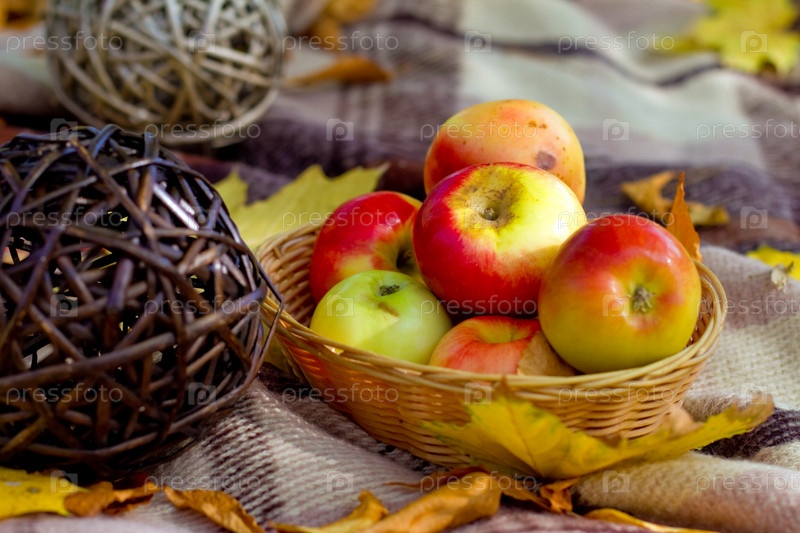 Яблоки и соломенные шары на клетчатом пледе