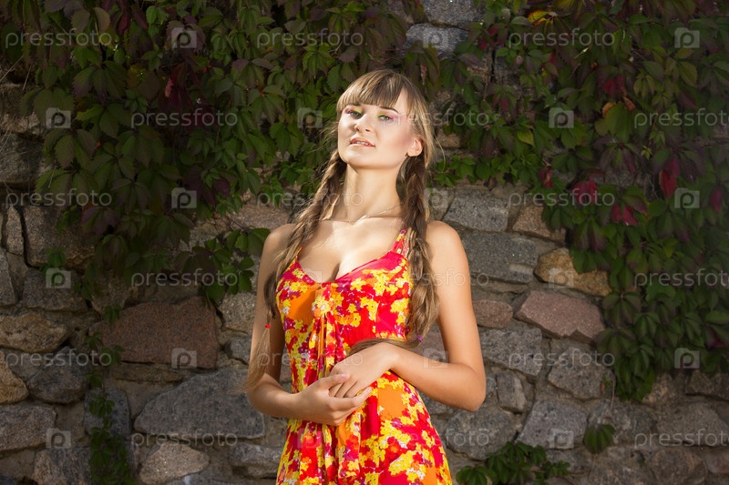 Портрет красивой девушки с длинными русыми косами в ярком платье и с ярким макияжем