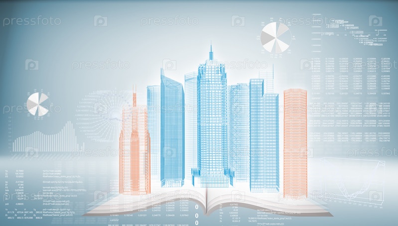 Здания в стиле хай-тек на синем фоне