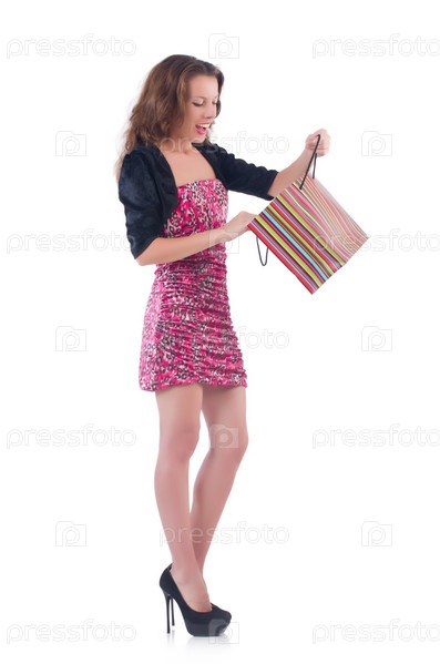 Девушка после удачного похода по магазинам на белом фоне