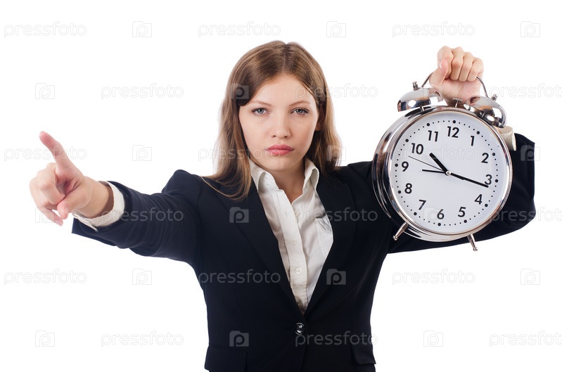Бизнес-леди с часами, изолированная на белом фоне