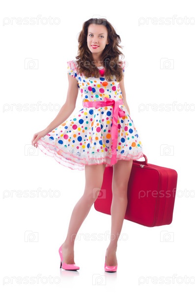 Женщина с красным чемоданом, изолированная на белом