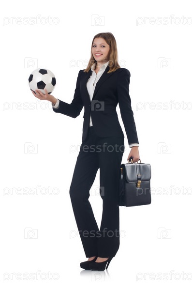Бизнес-леди с футбольным мячом на белом фоне