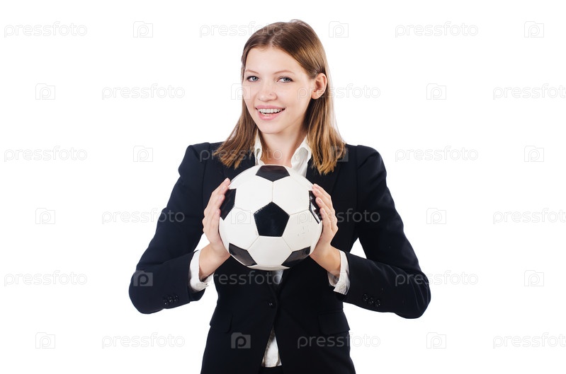 Бизнес-леди с футбольным мячом на белом фоне