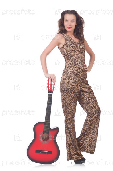 Женщина в леопардовом костюме с гитарой