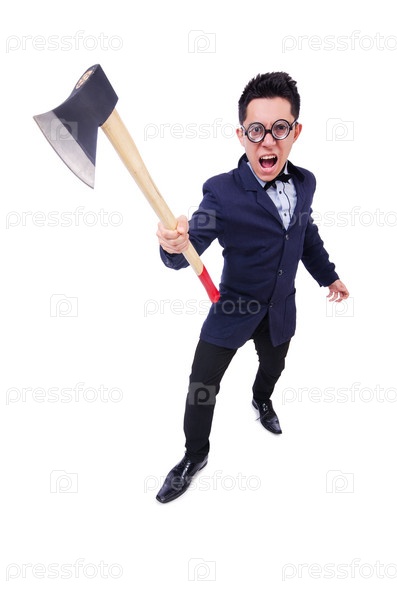 Смешной бизнесмен с топором на белом фоне