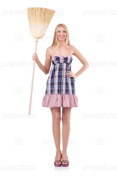 Молодая женщина с веником на белом фоне