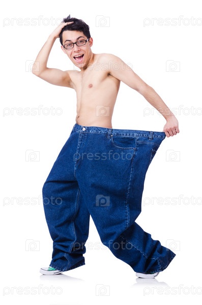 Забавный мужчина в больших джинсах, изолированный на белом фоне