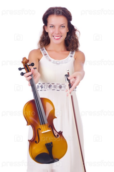 Молодая девушка со скрипкой на белом фоне