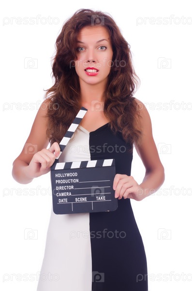 Женщина с кинохлопушкой, изолированная на белом фоне