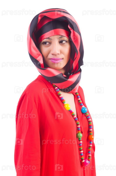 Женщина в красном шарфе на белом фоне