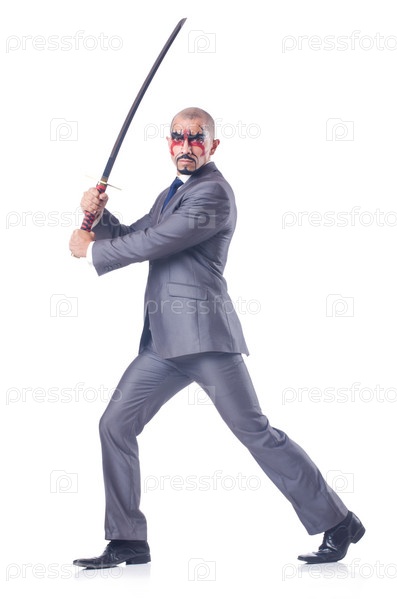 Бизнесмен с мечом, изолированный на белом фоне
