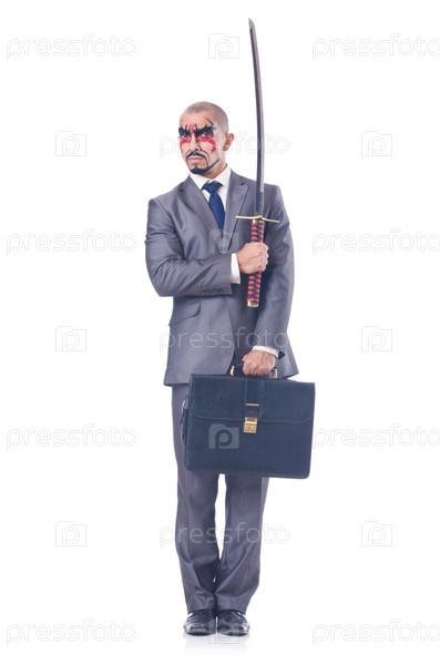 Бизнесмен с мечом, изолированный на белом фоне
