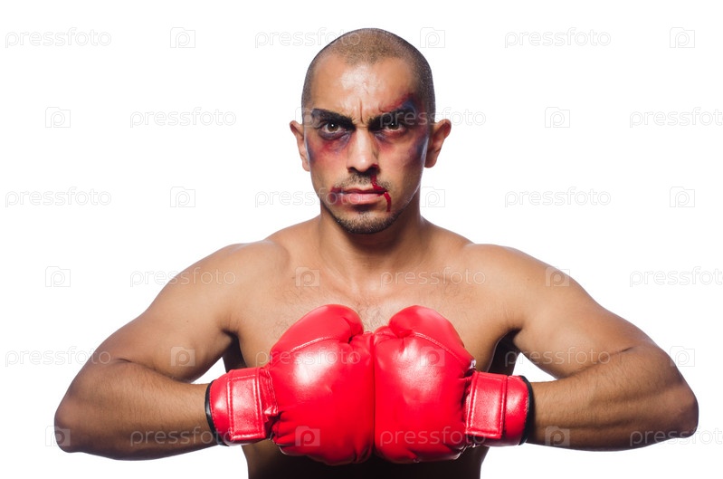 Сильно избитый боксер, изолированный на белом фоне