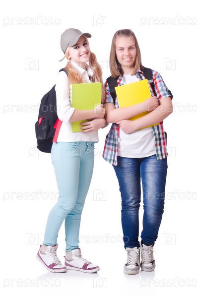 Пара молодых студентов на белом фоне