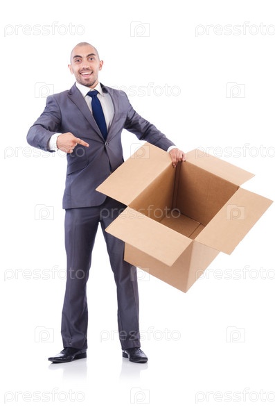 Бизнесмен с коробками, изолированный на белом
