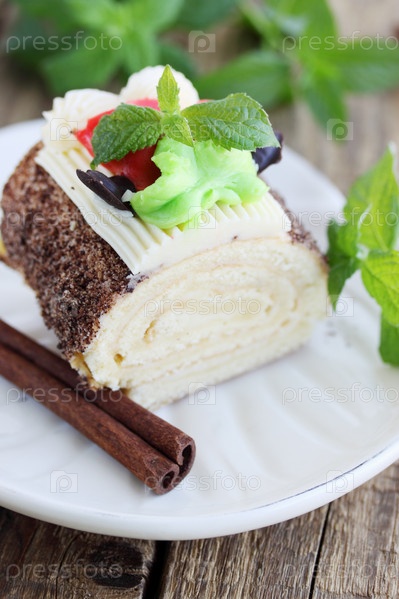 Сладкий бисквитный рулет с кремом и мятой