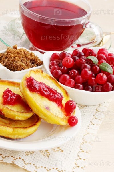 Жареные блинчики с свежей клюквой и чай из гибискуса