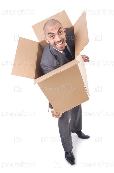 Бизнесмен с коробками, изолированный на белом